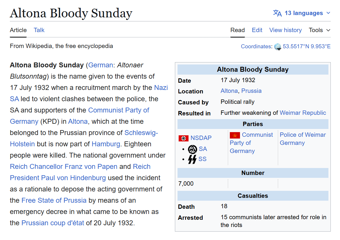 In june 1932, the SA held a peaceful march in a small town. At the same time, the Antifaschistische Aktion demonstrated against the march. Eventually, some antifascist agitators started throwing blunt objects from the rooftops at the SA march and fired rifle rounds nearby. This caused a panic and the SA started beating those who had thrown objects at them. A riot ensued that led to burning and multiple deaths. This led to hindenburg disolving the government of prussia in the end.At the time multiple communists were investigated for rioting but nothing came of it. But when the nazis came to power, they tried 15 men for the deaths of 2 SA officers, and executed them. However, in 1992, the communists were exonerated by a german court as victims of nazi oppression, and in 2005 a plaque was placed at the site of their execution.https://en.wikipedia.org/wiki/Altona_Bloody_Sundayhttps://gedenkstaetten-in-hamburg.de/en/memorials/show/memorial-site-in-the-courtyard-of-the-former-altona-court-prisonStuff like this makes you glad that the nazis won the election. They were the only ones who took action against left-wing terrorism.