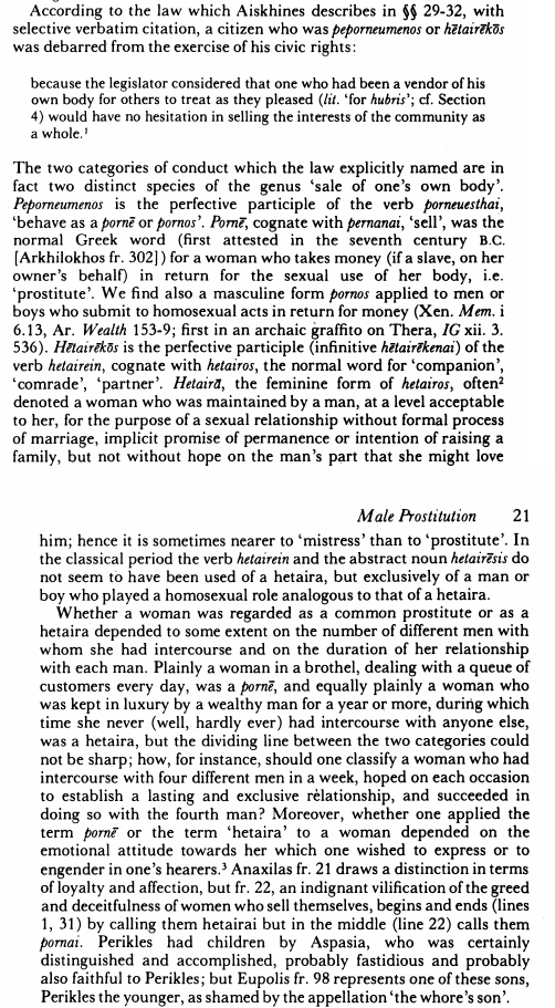 Now he mentions others that he prostituted themselves, contrasting them with the socially condoned practice of pederasty:>[158] Turning to those who share Timarchus’ habits, I shall avoid making enemies and speak of those who least concern me. Who among you does not know of Diophantus, known as ‘‘the orphan,’’ who arrested the foreigner and brought him before the archon for whom Aristophon of Azenia was serving as assistant? He alleged that he had been cheated of four drachmas owed for this service and cited the laws that instruct the archon to take care of orphans, when he himself had broken those which cover chastity. What citizen was not offended by Cephisodorus, known as the son of Molon, who had defiled his most beautiful appearance with the most infamous acts? Or Mnesitheus, known as the cook’s son, and many others whose names I purposely forget.>[159] I don’t want to pursue each of them by name spitefully. In fact, in my love of my city I would dearly wish to have a shortage of such cases to cite. But now that we have mentioned some examples of each type, dealing separately with the objects of chaste love and those who abused their own persons, I want you now to answer this question from me: to which category do you assign Timarchus, to the people who have lovers or to the prostitutes? So then, Timarchus, do not try to desert the society you have chosen and defect to the way of life of free men.Again, the monetary exchange is stressed.