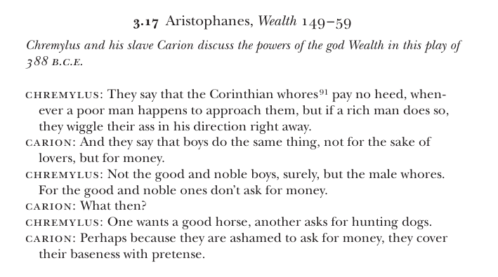 Pic rel. is Aristophanes' satirical take, highlighting that there was a perceived difference between a socially condoned pederastic relationship, and a mercenary one.Anticipating the defense argument that Aeschines can not provide evidence that Timarchus was taxxed for engaging in prostitution (which, if was as known about as he implies, tax collectors would have known about):>[119] That consummate speaker Demosthenes claims that either you must expunge the laws or else you must pay no attention to my arguments. He says he is amazed if you don’t all remember that every year the Council sells off the prostitution tax, and that those who buy the right to exact the tax do not guess but have precise knowledge of the people who engage in this trade. While I have had the audacity to charge that Timarchus has no right to address the people when he has prostituted himself, Demosthenes claims that the practice itself calls not for an allegation from a prosecutor but for a deposition from a taxman who has collected the tax from Timarchus.>[120] Men of Athens, see whether you find the reply I make to this simple and frank. I am ashamed for the city’s sake if Timarchus, the people’s adviser, the man who has the nerve to serve on embassies to the rest of Greece, will not attempt to cleanse his reputation of the whole business but instead will query the locations where he offered himself and ask if the tax-collectors have ever collected the prostitution tax from him.
