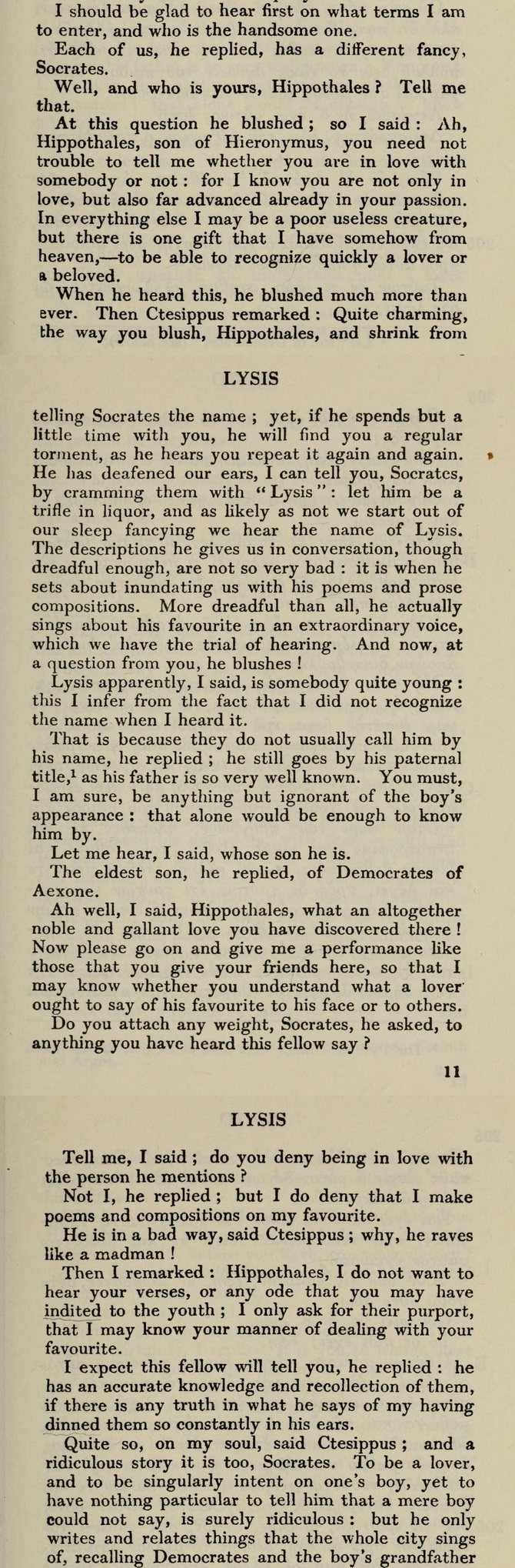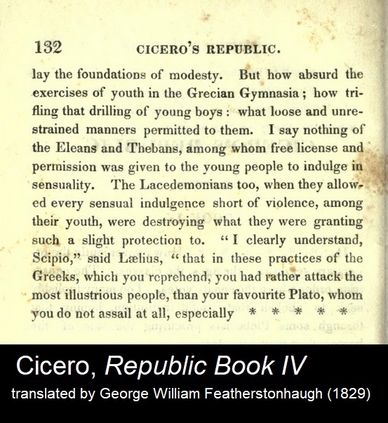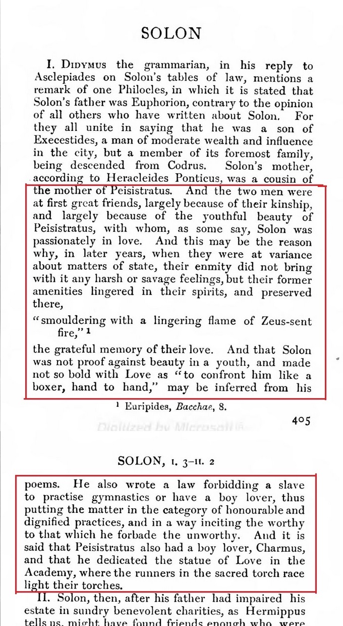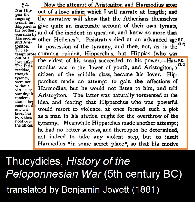 Further distinction between acceptable pederasty and prostitution:>[155] But I don’t want to talk at excessive length about the poets. Instead I shall tell you the names of older men who are well known, and young men and boys. Some of these have had many lovers because of their beauty, while others are still in the bloom of youth now; but none of them has ever been exposed to the same accusations as those made against Timarchus. And in contrast I shall give you the names of men who have practiced shameful and blatant prostitution; remembering these will help you to put Timarchus in the proper category.>[156] I shall start with the names of people who have lived in the honorable manner that befits free men. Men of Athens, you know that Crito the son of Astyochus and Periclides of Perithoidae and Polemagenes and Pantaleon the son of Cleagoras and Timesitheus the runner were in their day the most beautiful not only of the Athenian citizens but in all Greece, and that they attracted the largest number of lovers, and the most decent. Yet nobody has ever found fault withthem.>[157] Again, among those who are young men or still children even now, there is Iphicrates’ nephew, the son of Tisias of Rhamnus, who bears the same name as the defendant Timarchus. Though he is good-looking, he is so foreign to shameful conduct that the other day, at the Rural Dionysia during the performance of the comic plays at Collytus, when the comic actor Parmeno spoke an anapaestic line to the chorus in which mention was made of certain ‘‘big Timarchian prostitutes,’’ nobody suspected a reference to the young man; everyone saw a reference to you. So firm is your claim to the practice. And again there is Anticles the sprinter and Phidias the brother of Melesias. Though I could mention still more, I shall stop there, to avoid seeming to flatter any of them with my praise.