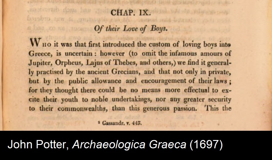 There's a pretty big rabbit hole which I haven't flushed out about the introduction of Pederastie to western vocabularies and the assumption that greeks had homosexual relationships. Of course this happened around the renaissance