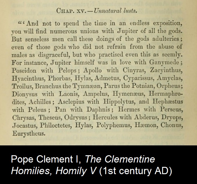 >>18062521Early Christian writers writing to their Greek audiences mentioned the homosexual activities of the Greek gods. Presumably this means they are counting on their audience being familiar with these myths and accepting the validity of the criticism
