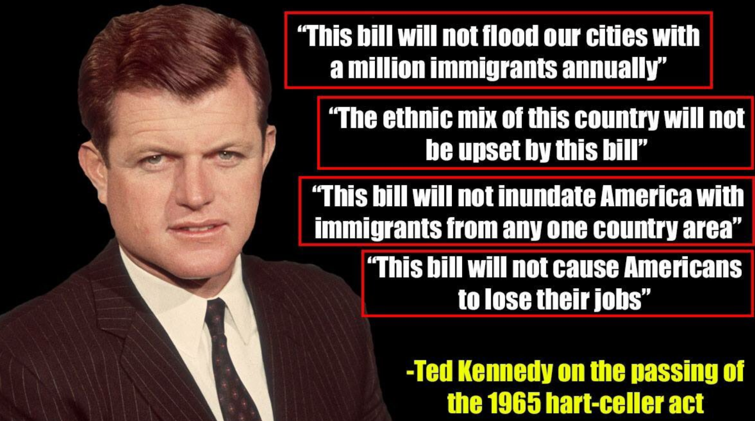 >>18078256You're that one anon that hyper-focuses on the part where a limit on western-hemisphere immigration, technically making it harder for a Mexican to migrate(legally) than before, but you deliberately ignore the introduction of chain migration which massively inflated the number of non-whites in the country. Also the fact that this law explicitly forbids the US government from considering ethnic preservation as part of its immigration policy.
