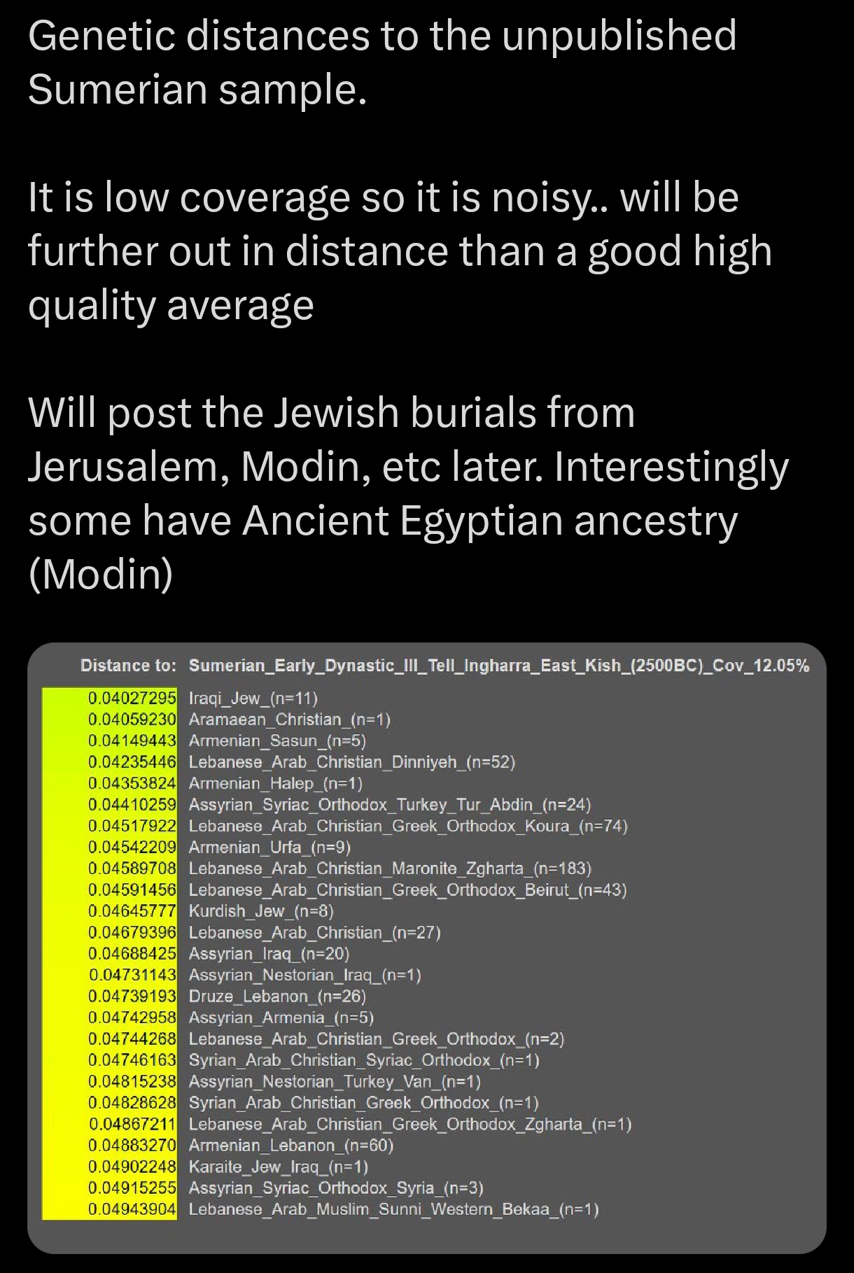 I wrote a long time ago that the Sumerians would most likely be closest to modern Iraqi Jews, and then to Assyrians and Armenians.