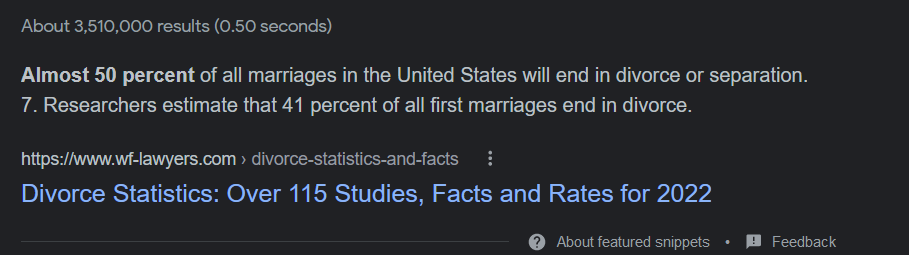 I've been married for 15 years because I dont give a fuck i just do what I think is best for my family. Most of these failed marriages are tards who think you can turn a whore into a wife. I got my wife pregnant in college and I made it work because my son's chance at being the best he could be means more to me than any of the other bullshit.