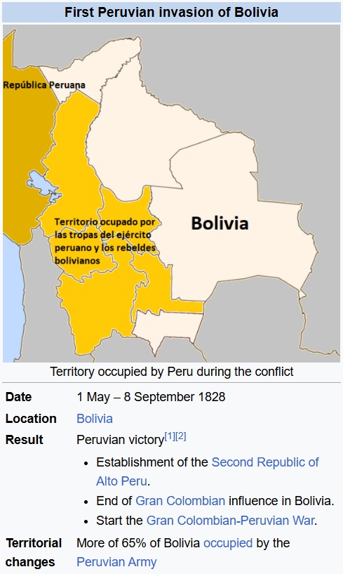 >>18095859>SucreHe was a Gran Colombian (Venezuelan) who ruled over Peru after Bolívar, who himself had taken power after San Martín left Peru. Sucre also became president of Bolivia.Another caudillo, Andrés de Santa Cruz y Calahumana, known as the "Caudillo of the Andes," was "Bolivian" by birth. His father was Peruvian, and his mother Bolivian. He led both countries simultaneously during the Peru-Bolivian Confederation. Earlier, he had become president of Peru, and later, in 1829, he became president of Bolivia, the year after Sucre stepped down (1828).Technically, Santa Cruz had been elected president in 1828, but he did not assume office at that time. In the meantime, a series of caudillos seized power during a period of crisis, partly triggered by Agustín Gamarra’s invasion of Bolivia.In colonial times, Santa Cruz was heir to an Aymara chieftainship through his mother.