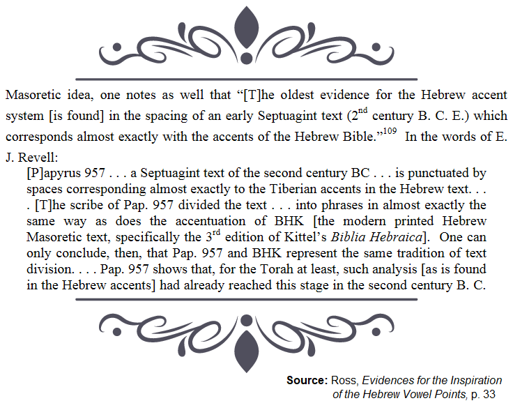 >>18100829>The original Old Testament didn't have vowel points, they started using them after a significant portion of Jews no longer spoke Hebrew as their first language,Jerome referred to these vowel points in ancient times (see the encircled text in attached). The difference between the word “ מַטֶּה ” = “staff” and the word “ מִטָּה ” = “bed”, in Hebrew, is only a difference of vowel points. Other than the vowel points, the two words are literally the same. Jerome had to be aware of the Hebrew vowels in this verse, to say that it says "differently" in Hebrew.Papyrus 957 (referenced here >>18098636) further has spacing that implies the vowels and punctuation marks that would divide the text into verses already existed before the New Testament was written.There is other evidence of the Qere and Kethiv readings with vowel points already existing side by side, simply by comparing ancient translations of the Hebrew text that were made into Greek and Syriac. This is because there are examples where one ancient translation took one pronunciation of a word, and the other ancient translation took the other one, wherein the only difference in the original Hebrew was in the vowel points of the Q'ri reading versus the Kethiv reading.For example, the difference between the name “ עֹופַי ” (Ophai) as written in the text (i.e. Kethiv) and the Q’ri reading of “ עֵיפַי ” (Ephai) in Jeremiah 40:8. The Syriac and Targum translations followed the Q'ri pronunciation of this name (it only had different vowel points, nothing else was different) while the Septuagint Greek translation followed the Kethiv pronunciation. This implies both readings existed, with their differing vowel points, since those ancient translations were made.Combined with the previous evidence, the vowel points clearly existed for the last 2000 years, at least. Considering the manuscript evidence as well, I'd say we have an indication that the vowels and punctuations actually date to around Ezra's time.