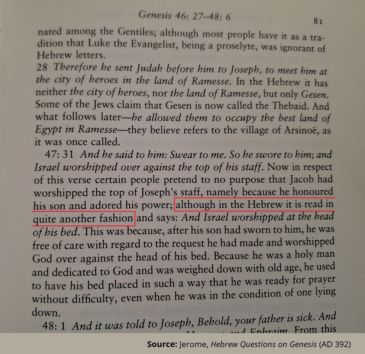 >>18102669>>18102696Also, if you were referring to Jerome, he obviously knew what the New Testament said. Despite knowing what the New Testament in Hebrews says, he still stated clearly that the Old Testament in Genesis 47:31 says "bed" according to the original Hebrew (see >>18100932). His only reason for doing so is because that word has different vowel pointings. Otherwise, it's identical to the word "staff." The passage in Hebrews 11 (if anything) only further confirms that he couldn't be relying on that text to claim that the original text of Genesis says what it says.Genesis 47:31 is talking about Jacob bowing himself at the bed's head after Joseph promises to bury him in the promised land. Whereas Hebrews 11:21 is clearly talking about a later event where Jacob was dying and blessing Ephraim and Manasseh. We learn from Hebrews that he also worshipped while leaning on his staff, which doesn't contradict Genesis 47:31 since Genesis is actually talking about an earlier event where Joseph promised to bury Jacob in Canaan. Still, you could see how some people might get these two events confused if they didn't pay close attention to the details.