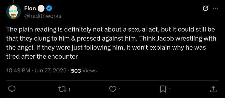 >>18104867>they had no clothes on, and I did not see their private parts at all. They had very little flesh. Then they came and started riding on the Messenger of Allah ﷺ.What's worse is that what I'm copying right now is a mistranslation. The "on" preposition isn't present in Arabic, which means that the source I'm quoting is committing shirk by modifying a binding hadith — as it is a part of the Sahih al Bukhari, no matter whether or not it's considered strong or weak, especially since other narrations by Ibn Mas’ūd were considered strong, except this one, for no other reason that because it demeans Mohammad.