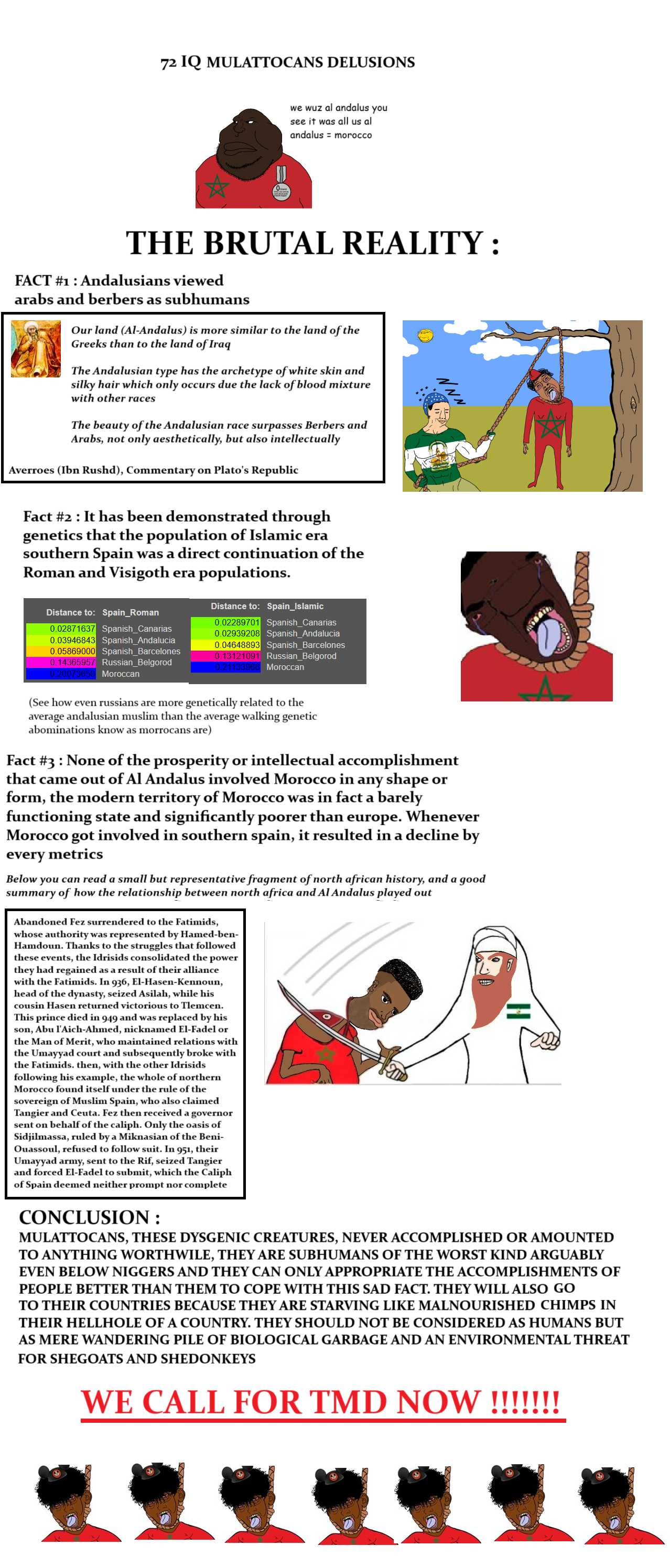 >>18124008>Peru 99 IQ>Tunisia 97 IQ>Morocco 96 IQ>Guatemala 91 IQNigger you really think I'm going to take this HOLY FUCK I'M DYING THIS APE IS EXPECTING ME TO TAKE THIS SERIOUSLY HAHAHAHAHAHAHAHA>No. I am using relevant passages from studies on the subject matterNo, you're selecting passage while omitting context or the rest. For example one of the extract you posted explicitely state that the moroccan like sample is an outlier, dishonest dumb chimp>You're simply displaying your lack of historical knowledge. Andalus extended into France. Ever heard of Arbuna?I know very well but trying to use french samples to talk about southern spain demographics is beyond retarded.>We conquered Iberians and colonized them for 700 years but the reverse never happenedYou didn't, a caliphate based in Syria which conquered you proceeded to conquer the visigoth kingdom just after, retarded we wuzzing baboon monkey chimp. Subhuman garbage, just admit that you're an inferior being, that your life has no worth and that you can't reasonably argue with someone who is intellectually far above you. The fact that you still think I'm a latinx demonstrate how genuinely mentally incapacited you are.