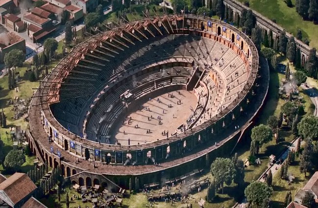 A reconstruction of Pompeiis Arena. It is as far we know the oldest stone amphitheater still in existence. It is a much more primitive than later Roman stadiums.