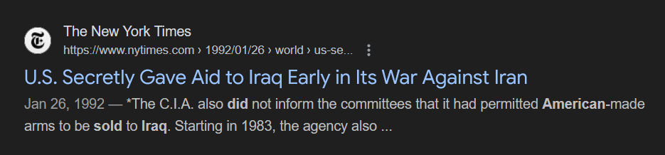 >>18240275>the US had sold him all his military hardwareThis isn't even remotely true. Most the Iraqi military's hardware in 1991 was sourced from>Warsaw Pact>China>SFR Yugoslavia>France>West Germany>United KingdomMost of the American equipment in the Iraqi inventory was either WWII vintage or had originally been sold to Iran in the 1970s, captured by Iraq, and subsequently pressed into service.