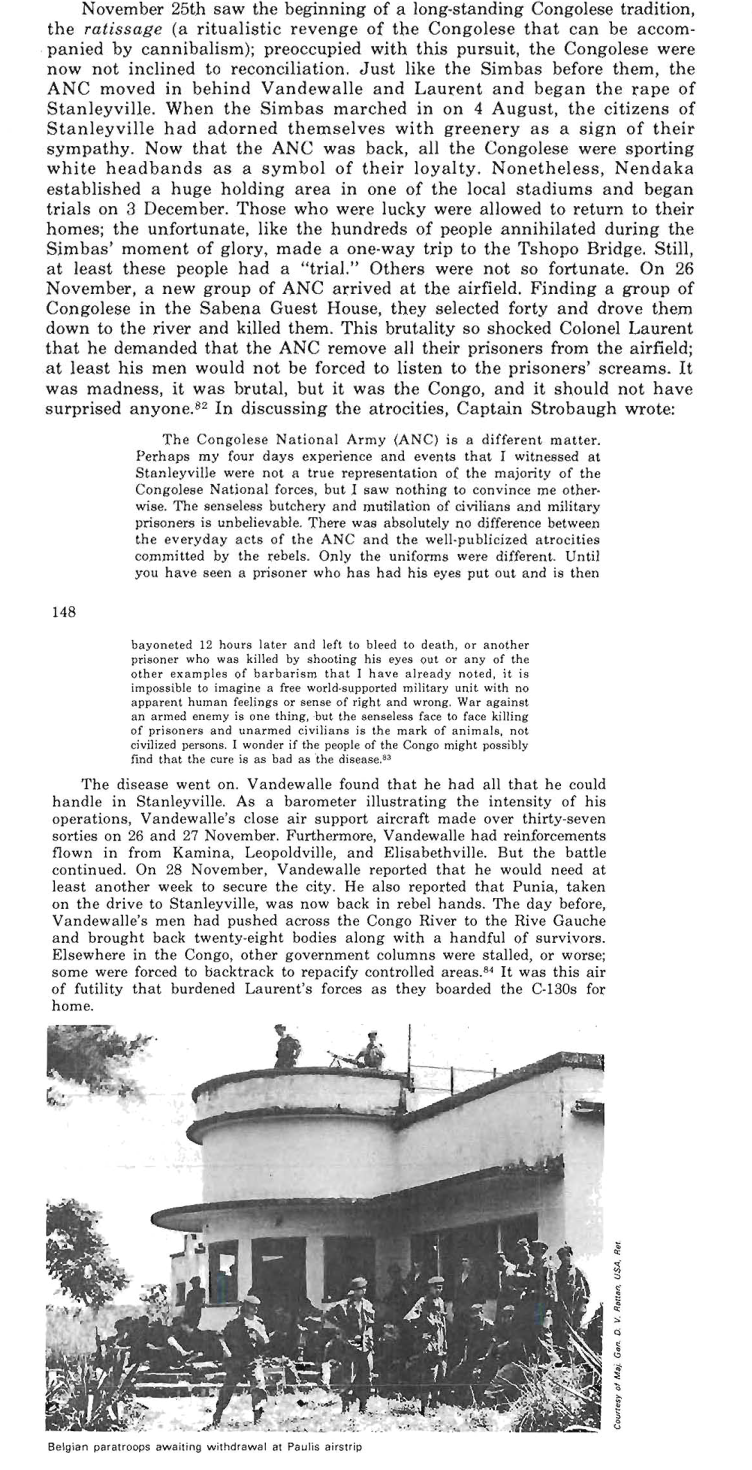 Eyewitness account of captain Donald Strobaugh, an American officer who was attached to Belgian troops in Congo when them and the Congolese government's ANC (Armée nationale congolaise) retook Stanleyville from the rebels during the Simba rebellion of 1963-1966.African solutions truly are African problems and vice versa. Source is 'Dragon Operations: Hostage Rescues in the Congo, 1964-1965' by Thomas P. Odom (1988).