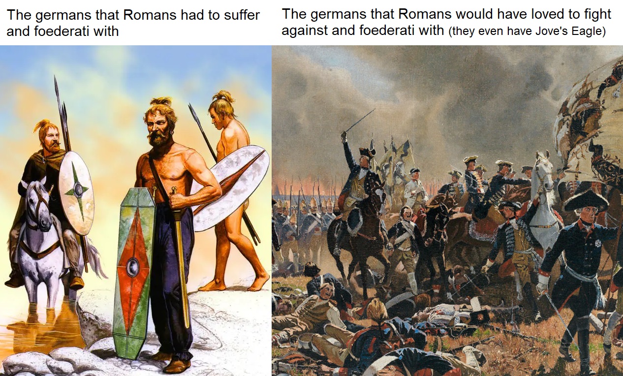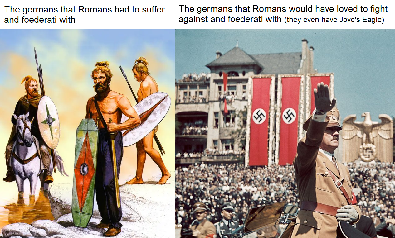 Why were Romans so unlucky with the germans?Why did germans evolve sooo slow?I think Germanicus (Rest in Elysium) cried during the WW2 seeing how cool were the germans of those times and how ugly were the ones he had to fight back then.PD: This was the dream of Arminius, an independent but Romanized Germania. I wonder if his Germania would have had as language Latin or a German Romance.