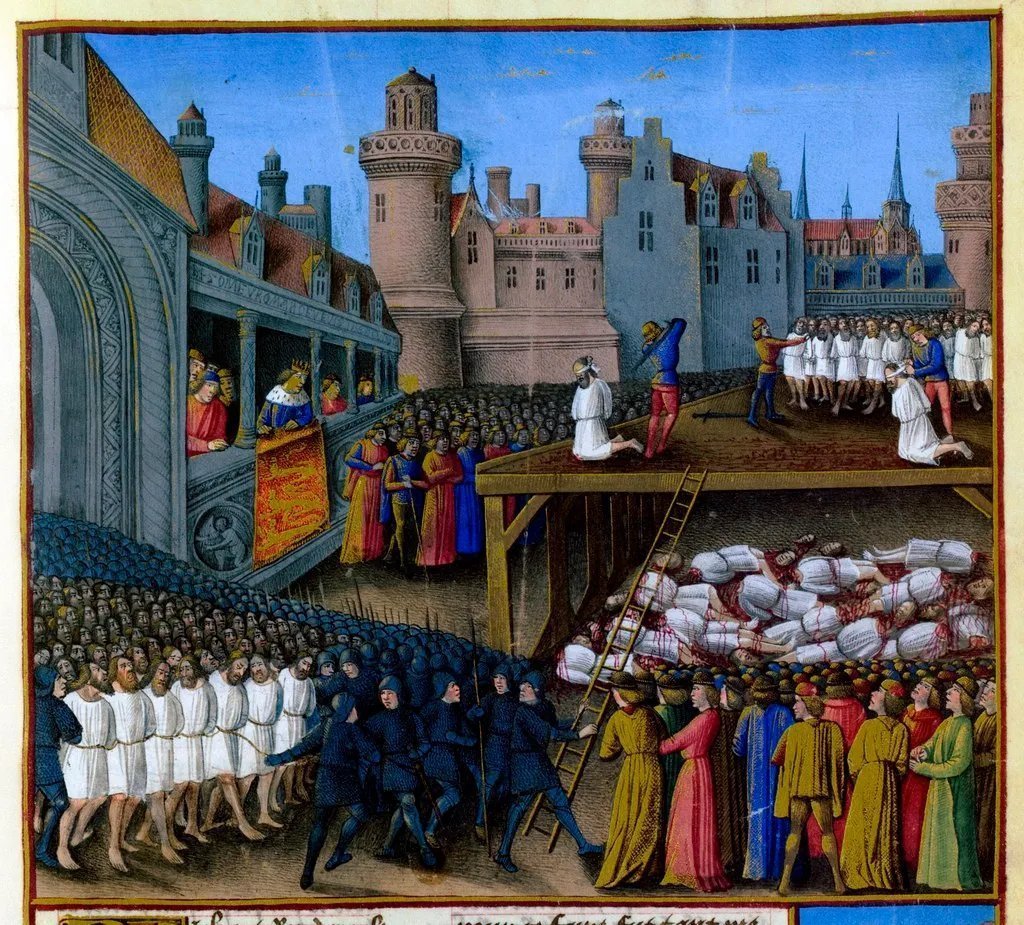 "Medieval French painting showing the massacre of Ayyubid captives by the English crusaders at Ayyadieh"So, they depicted the Muslims as the good guys here (all clad in white, and have normal faces instead of deformed faces). Therefore, Europeans knew that they were the bad guys and they were the invaders. No need to glaze the crusaders here now.