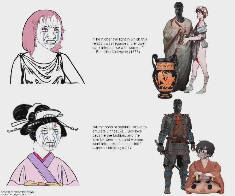 >>18258823>posting ancient historical sources is D&C>>18259003There is currently a taboo against sex between legal adults and people under an arbitrary age due to feminism, so it doesn't matter how rational a position you might take on the matter, people will still become irrationally butthurt towards you. >>18259096>Notice how these are people talking about other groups of people they didn't like.Most of these sources were written by people that lived in societies where pederasty was openly practiced. Aristotle was a pederast himself and also makes complimentary remarks about the Celts.>This was common sense stuff even back thenOnly being a passive partner in a homosexual relationship and enjoying taking the passive role was viewed with any level of contempt in Greek society, and this was not a universal view, which is why the orator in that passage says "some say", rather than "all say", and why he himself takes the position that being a passive homosexual partner is manly.Feeling attraction towards beautiful male youths was expected of Greek men. What you insinuate was common sense back then was not actually common sense.