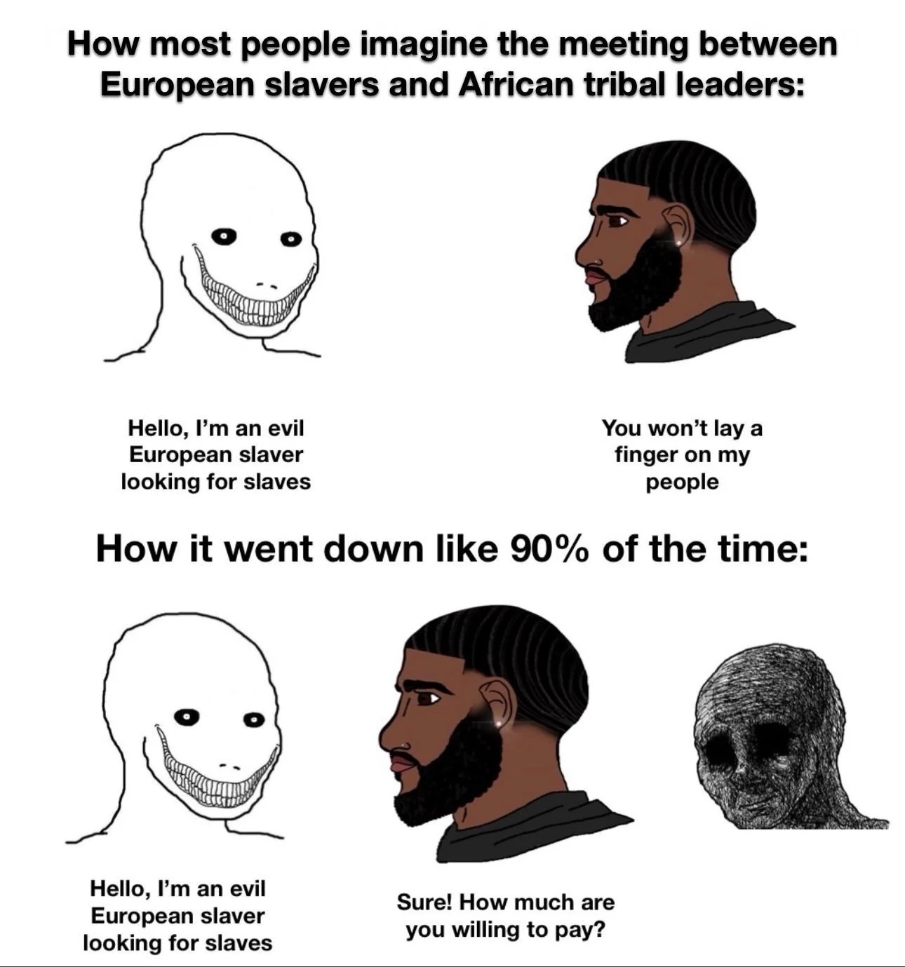 >>18257834>You think East Africa didn't have slavery?The OP pretty much implied it's about the Trans-Atlantic one and many groups in Eastern Africa did not make use of slaves or was part of the "net to the ship" pipeline. Hell a fuckton of these "why didn't the African apologize though" BS is levied at many Africans who were firect victims of the TA trade or as a source of slaves in general lol.