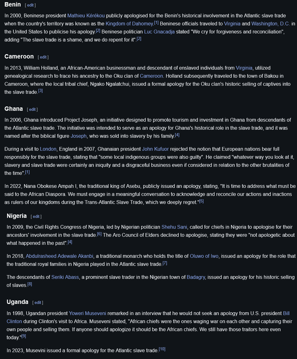 >>18257511And not all of them participated in the transatlantic slave tradeLike of those countries Uganda didn't even need to apologize since they're in central-east africa and all the slaves came from the gulf of guinea region and angola lol