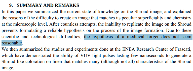 >>18265002>experts on religious hoaxes of antiquitythe "experts" who make a living by calling artifacts hoaxes also called the shroud a hoax, and made money doing it, surprise!>camera obscura technologythat described basic optics, not modern photography technology. Grasping at straws.>Because he blasted light at it so that it stainedSo a medieval forger just blasted 34 trillion watts of UV laser in a few nanoseconds, something that cannot even be done today.The shroud is covered in real human blood and marks on the image showing a man who was whipped, crowned with thorns, and crucified, matching the descriptions of the crucifixion from the bible.>Enea scientists warn, "it should be noted that the total power of VUV radiations required to instantly color the surface of linen that corresponds to a human of average height, body surface area equal to = 2000 MW/cm2 17000 cm2 = 34 thousand billion watts makes it impractical today to reproduce the entire Shroud image using a single laser excimer, since this power cannot be produced by any VUV light source built to date (the most powerful available on the market come to several billion watts )”.>The Savoy family who are the first documented owners of the shroudNo. It's documented that it was held in France in the possession of a French crusader then later transferred to the Savoy family.>connected to the catholic churchThat's not how it works. The Catholic church has official relics. The Shroud of Turin is not a Catholic relic.So your claim is that a medieval hoaxer literally tortured and crucified somebody, wrapped them in a shroud once they were dead, then using an unknown advanced medieval light blasting technology that we don't have today somehow forged a molecular image a few microns thick on the surface of the shroud for an audience 800 years in the future when his purpose was actually to convince Catholics of his time period to stop persecuting alchemists. Got it.