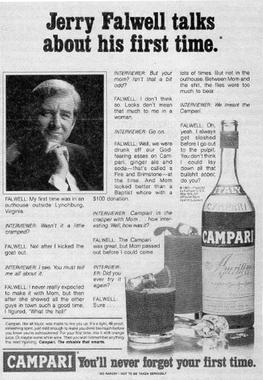 Hustler Magazine, Inc. v. Falwell (1988) saw the Supreme Court rule that parodies of public figures, even if offensive or demeaning, are protected by the 1st Amendment. The November 1983 issue of pornographic magazine Hustler Magazine ran a parody ad targeting Christian evangelist Jerry Falwell. The ad, a parody of Campari liquor ads that featured brief, contrived interviews wth celebrities that began with asking them about their first time, which in this case was meant to refer to the first time they'd drank Campari. The Hustler parody, written by Terry Abrahamson and drawn by Mike Salisbury, included a headshot photo of Falwell and the transcript of a spoof interview where Falwell misinterprets the question about his first time and goes into a story about how he lost his virginity to his mother in the family outhouse while they were drunk on Campari. He goes on to say his mother looked "better than a Baptist whore with a $100 donation" and he had sex with her because "she showed all the other guys in town a good time." When asked if he'd ever done it again, Falwell says "Sure, but not in the outhouse. There was too much shit and flies in there" and "I always drink Campari before heading out to the pulpit. You think I could lay down all that bullshit sober?"