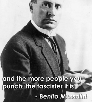 >>18288538"fascism is when you punch peoplethe more you punch people more fascist you is."-Bento MussolingiRetard