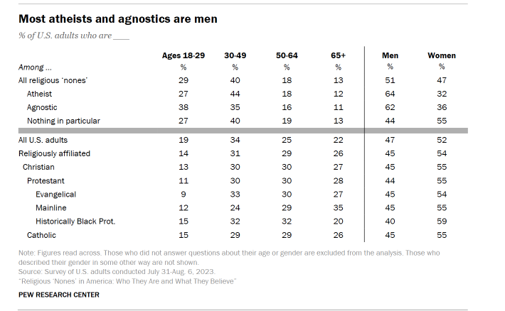>>18291738Despite how it might appeal online with disproportionate discourse about "liberal women", women outnumber men in all denominations and are much less likely to be atheists than men are. Tradlarpers literally have no excuses to stay single.Also it is funny how zoomers are less atheist but also much less religiously affiliated, they might just meet someone to marry if they actually went to the church and met fellow Christians for once instead.