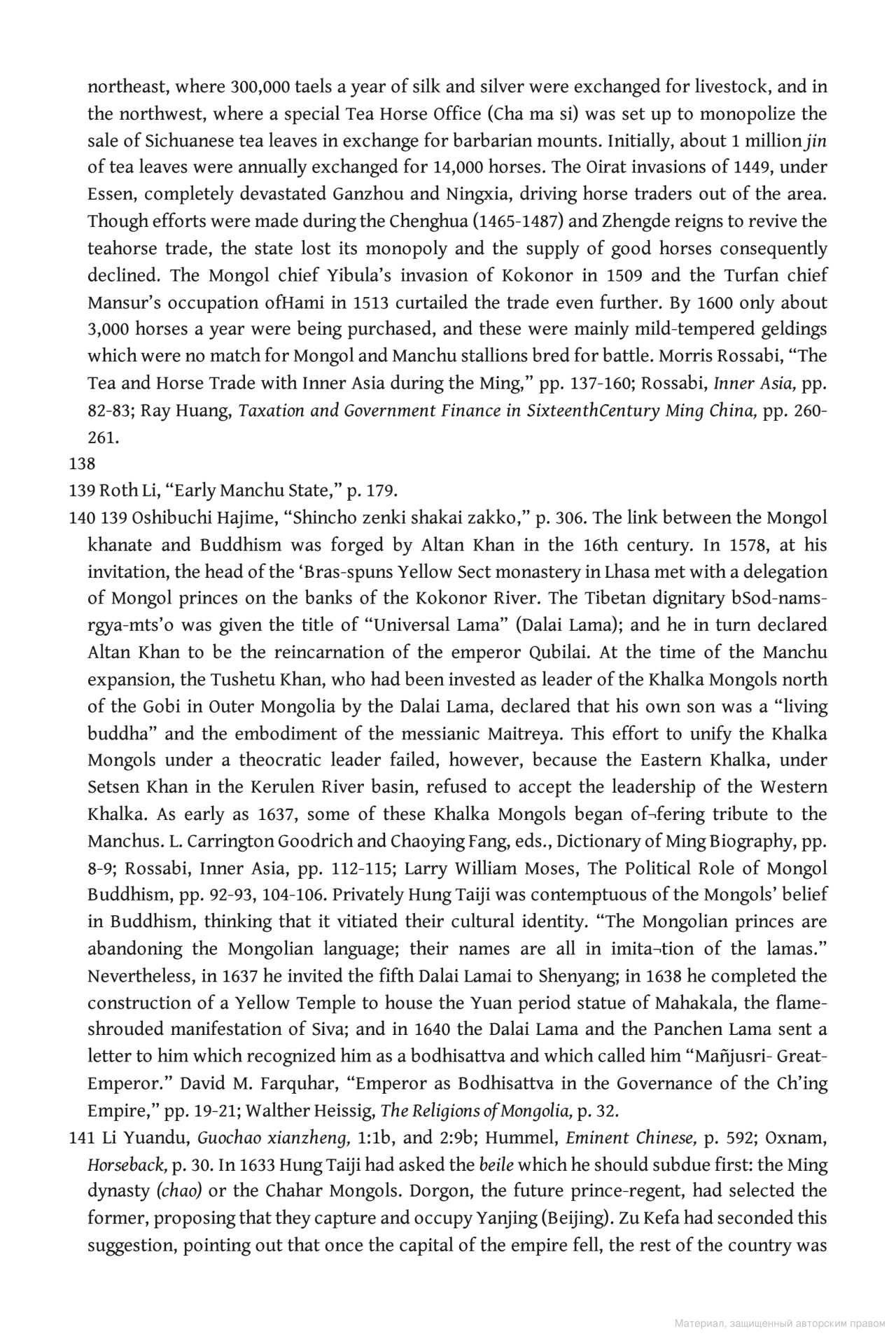 >Concern with military conquest, interest in Ming government structure, and recognition of some basic Chinese values did not exclude or diminish Manchu attention to non-Chinese people and cultures. Control over Inner Mongolia gave the Manchus the opportunity to style themselves as protec- tors of Tibetan Buddhism, which helped consolidate their rule over the Mongols and foreshadowed their claim to Tibet. After converting to Bud- dhism during the late sixteenth century, some chiefs of the eastern Mongol tribes had turned their residences into centers of religious and literary activities with ties to the religious authorities in Tibet. The Manchu leaders showed little interest in becoming Buddhists themselves. Hung Taiji did not shy away from condemning Buddhist lamas as “liars,” “incorrigibles,”and “people who squander goods.” 166 But he also took advantage of the Mongols’ adherence to Buddhism. He invited the Fifth Dalai Lama to Shen-yang in 1637, and a year later he completed the construction of a Yellow Temple to house a Buddhist statue which originated from the Yüan period and had belonged to Ligdan Khan. In 1640 he received a letter from the Dalai Lama and the Panchen Lama in which the two religious leaders recognized him as a bodhisattva and called him “Mañjus ´rı¯–Great Emperor.” 167 However, perhaps aware that reincarnations appealed to Mongols and Tibetans, who were used to the combination of secular rule with religious authority but did not appeal to Chinese Buddhists, Hong Taiji was careful about exploiting this honor.