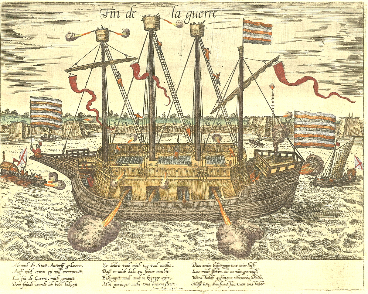 >>18295669The 80 Years War in general was crazy. My favorite episode was the dutch "woodclad" Finis Belli deployed during the Siege of Antwerp in 1684/85 in order to breach the spanish blockade. >Antwerp gets encircled by the Spanish who in good order built multiple forts so that they could control the river Scheldt and thus the supply to the city>but they fail to take over one key dutch fort and the blockade is thus incomplete>np, we just built some more forts and a fortified bridge (heavy tree trunks, large beams, iron chains, walkways covered with shot-proof parapets) to cut off the city - said the spanish>the dutch just flood the surrounding lands (works everytime)>the spanish forts become islands>fighting ensues over those "islands" with all sorts of low draft barges and boats>the fortified bridge still needs to be destroyed so that heavier cargo ships can reach Antwerp>the dutch send two fireships (with blast chambers lined with masonry, stones, and other shit for shrapnel) against the bridge>fireship A runs aground and detonates harmlessly; fireship B reaches the bridge and a tremondous expolsion badly damages it>the dutch somehow fail to coordinate an attack and the spanish repair the damaged bridge>the dutch then focus on taking and demolishing a counter-dike in order to raise the water level so that the bridge could simply be bypassed>the dutch manage to take over a portion of the counter-dike and blow holes into it; enough that some resupply ships could pass>spanish counterattack ensues and the fighting continues for so long that the low tides comes in and grounds some of the dutch ships>the dutch are getting desperate and built a heavy woodclad barge/floating battery so that the fortified bridge could be attacked again>enter the Finis Belli: armored with heavy oaken planks, cork and oakum wrapped barrels; armed with at least 20 heavy cannons; complement of 500 soldiers>it runs aground>the dutch finaly surrender