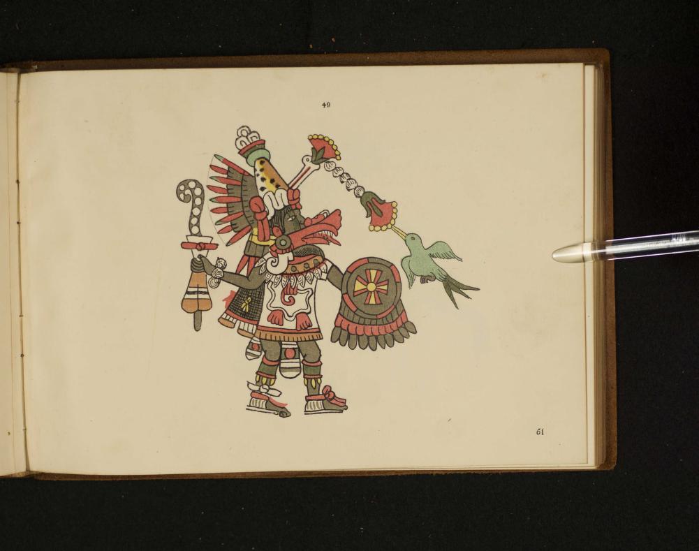 Ehecatl seems to have a large red bird beak that reminds me of a pelican or a flamingo or something. This is a symbol that is inextricably linked to Ehecatl