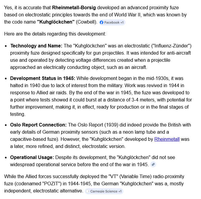>>18355154>>18355180Both Germany's research into centimetric radar and proximity fuzes was halted on Hitler's direct orders in 1940. They only started speeding R&D up again in 1943, when they started to lose the war.Even the rocket program suffered from this.>The years 1939-1942, when Hitler had blocked development and production of the V-2, were lost years.http://www.astronautix.com/p/peenemuende.htmlGermany was reluctant to make use of the cavity magnetron even after figuring it out in 1943, their own aircraft made use of it only towards the very end of the war. Maybe because of the aforementioned frequency drift which made them reject the thing in 1935?Some people say that Rheinmetall finished the German proximity fuze from the Oslo report in 1945, calling it 'Kuhgloeckchen'. But I don't know if there are any credible sources for this.Btw the proximity fuze was so important for the allies because with them they had a fair chance to shoot down V1 weapons which traveled at roughly the speed of sound. Germany on the other hand didn't face aircraft this fast, instead swarms of bombers.(2/2)