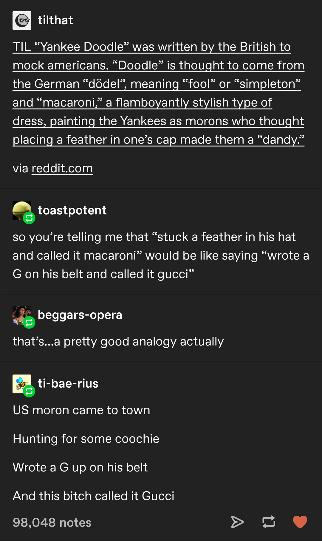 the holocaust, slavery, colonialism, the holocaust, genocide, the oppression of black folx, assigned at birth female folx, lgbtq folx, transfolx and jews in the holocaust is more important than how wypipo built america, which was of course 100% due to black people picking cotton in the south not white industry and ingenuity, wypipo done did stoled all the factories and technology and roads and canals from the native americans and black people