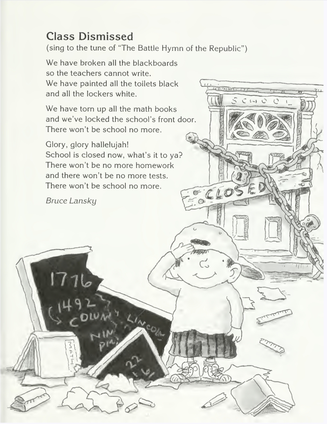 Sung to the tune of "Battle Hymn of the Republic":>Glory, glory hallelujah!>Teacher hit me with a ruler>I hid behind the door>With a loaded .44>Now we don't have a teacher anymore!Parody of the theme to the "Popeye the Sailorman" cartoon:>Popeye the sailorman>He lived in a garbage can>He turned on the heater>And burned off his peter>He's Popeye the sailorman!