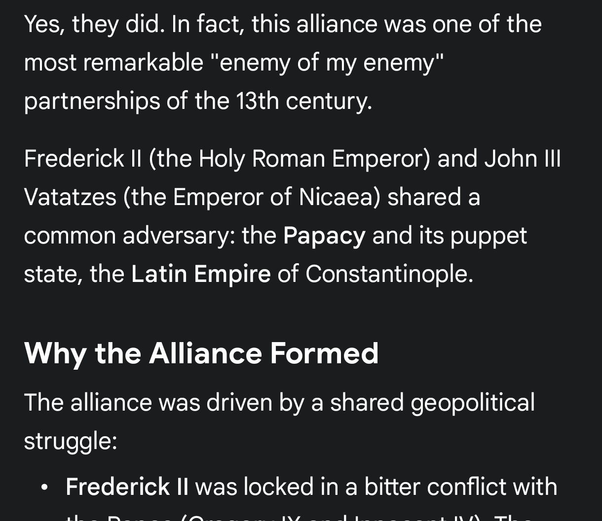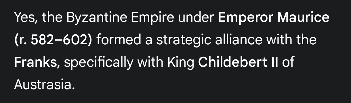 >>18358697>GothsAnastasius literally sent diplomats to king Clovis' court to hand him gifts and imperial regalia in exchange for him fighting the Goths.>Lombards Maurice formally allied with queen Brunhilda of Austrasia and they invaded Northern Italy together around 600AD or late 500s or so.>Slavs Michael III convinced the East Franks to attack Bulgaria from the back in the 850s which was extremely successful and the pressure got them to make peace and convert to Christianity. They also both fought Slavs/Avars a bunch of times earlier albeit not simultaneously.>ArabsIt was a bunch of times, not once. It was also supposed to be even more extensive than what happened historically, Louis the Pious and emperor Theophilius were planning a joint invasion of Egypt after they had retaken Sicily to completely destroy the Caliphate but I think Theophilius died and Louis was ousted from power or something like that I can't recall now.>Magyars Otto I literally sent embassies to Byzantium to discuss the "Magyar problem" and request aid.>NormansForgot to mention this one, there was also a marriage and formal alliance between the two against the kingdom of Sicily in the 1100s but they both got their asses beat and gave up on it.>Venice and Genoa >The French >The Pope Frederick II and John III Vatatzes of Nicaea signed an alliance against the Latin Empire. The Nicaeans received Western knights and crossbowmen from Germany that helped them retake Constantinople. There was also an incident later where the Pope was trying to launch an invasion of the restored Byzantine empire but the Hohenstaufens completely cockblocked him and destroyed his fleet.John VI Kantakouzenos also later attempted in the 1350s to ally with the HRE emperor against the Genoans and Venetians so they could force them to pay taxes but both empires were too fucked up by that point and it went nowhere.
