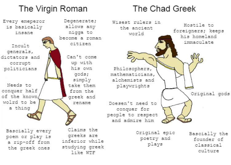 >>18363556scholars, heroic tales, philosophyeveryone impersonated the greeks, even the rormans and beyond the eastonly barbarians with inferior complexities larped as romans