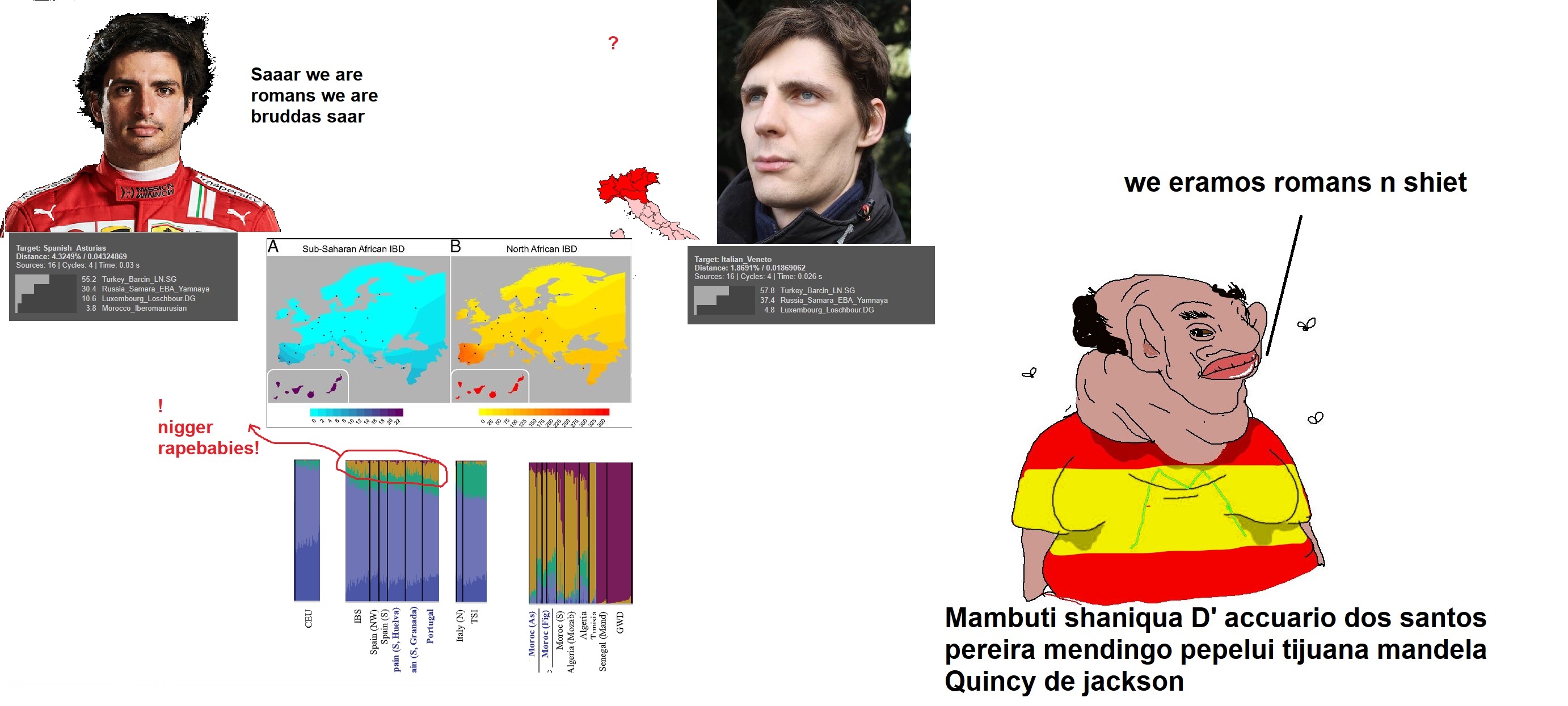 >Hitler viewed North Italians as strongly Aryan>Hitler praised the Arab occupation of Iberia as "cultivated," while referring to the Spaniards themselves as "lazy" and of "moorish blood;" he also slandered the Catholic Queen Isabel, calling her "the greatest whore in history." The German writer Wilhelm Pferdekamp, published many hispanophobic articles, including one titled Afrika beginnt hinter den Pyrenäen ("Africa begins behind the Pyrenees").Spain is the "bro thinks he's on the team" meme.