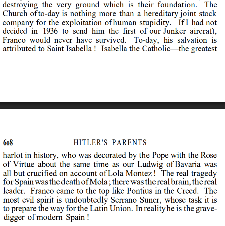 >>18360862>Spain is the "bro thinks he's on the team" meme.The only team Spain belongs to is Team Jesus.That being said, Hitler just repeated the usual anglo lies the world was fed with because he was angry Franco did not join the war... But when his generals suggested invading Spain he said "Absolutely not. The Spaniards once ruled the world; they are the bravest Mediterranean people. They would organize guerrilla movements behind our lines. You cannot enter Spain without the permission of the Spaniards".When the blue division entered he started to say things like "Considered as a force, the Spaniards are a band of ragamuffins. For them, a rifle is an instrument that should never be cleaned under any circumstances. Among the Spaniards, sentries exist only in theory. They don't occupy their posts, but if they do, they're asleep. When the Russians arrive, it's the natives who have to wake them up. But the Spaniards have never yielded an inch of ground. I have no idea of more fearless beings. They barely protect themselves. They defy death. What I do know is that our people are always happy to have the Spaniards as neighbors."And later: "If you read Goeben's writings about the Spanish, you will notice that they have not changed in a hundred years. Extraordinarily brave, hardened by privation, but fiercely undisciplined. One of our happiest initiatives was to allow a Spanish legion to fight alongside us".And finally, "A country that is impossible not to love. I don't know a single German who thinks otherwise. One of our first regional managers in Hanover was returning from Spain. He had no other desire than to go back there again. I have never met anyone who doesn't admire the Spaniards".
