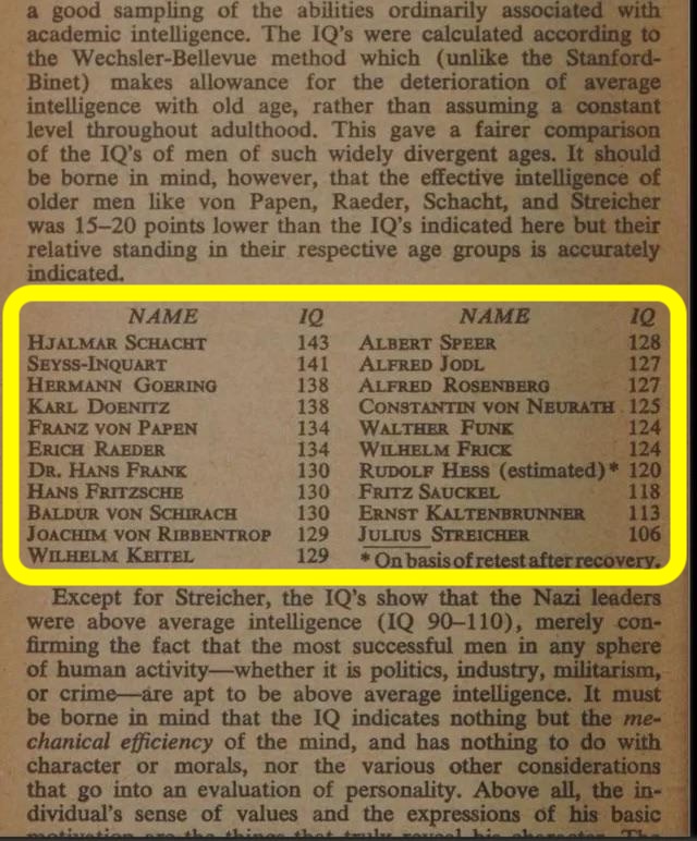Hitler was a genius, no doubt about it. But these scores from surviving Nazis are dubious. As the text says, this is adjusted for old age; compared to men aged 20-30, these guys with IQs in the range of 120-130 would have had IQs closer to 100-110.Also, a lot of these men weren't exactly geniuses in terms of their actions. I know, it's hindsight, but they made a lot of mistakes.>Seyss-InquartDeliberately caused a famine in the Netherlands, where he was the German military governor in 1944-1945. This was a war crime in every possible sense, it served absolutely no military purpose, and it ended up getting him hanged. It was just him being irrationally angry that the Allies had captured a third of the territory he governed by late 1944.>GoeringAs the wartime German joke goes: if you see a white plane, it's American. If you see a black plane, it's British. If you see no planes, it's the glorious Luftwaffe.>RaederTried to do what generations of German admirals had tried before: match the Royal Navy's surface fleet. And like all German admirals before him, he failed, badly, wasting a lot of time, men and resources in the process.>Von SchirachWas a Hitler loyalist until the bitter end, then became a 'reformed Nazi' too late - at least Speer had the common sense to do it early on and avoid further unpleasantness.