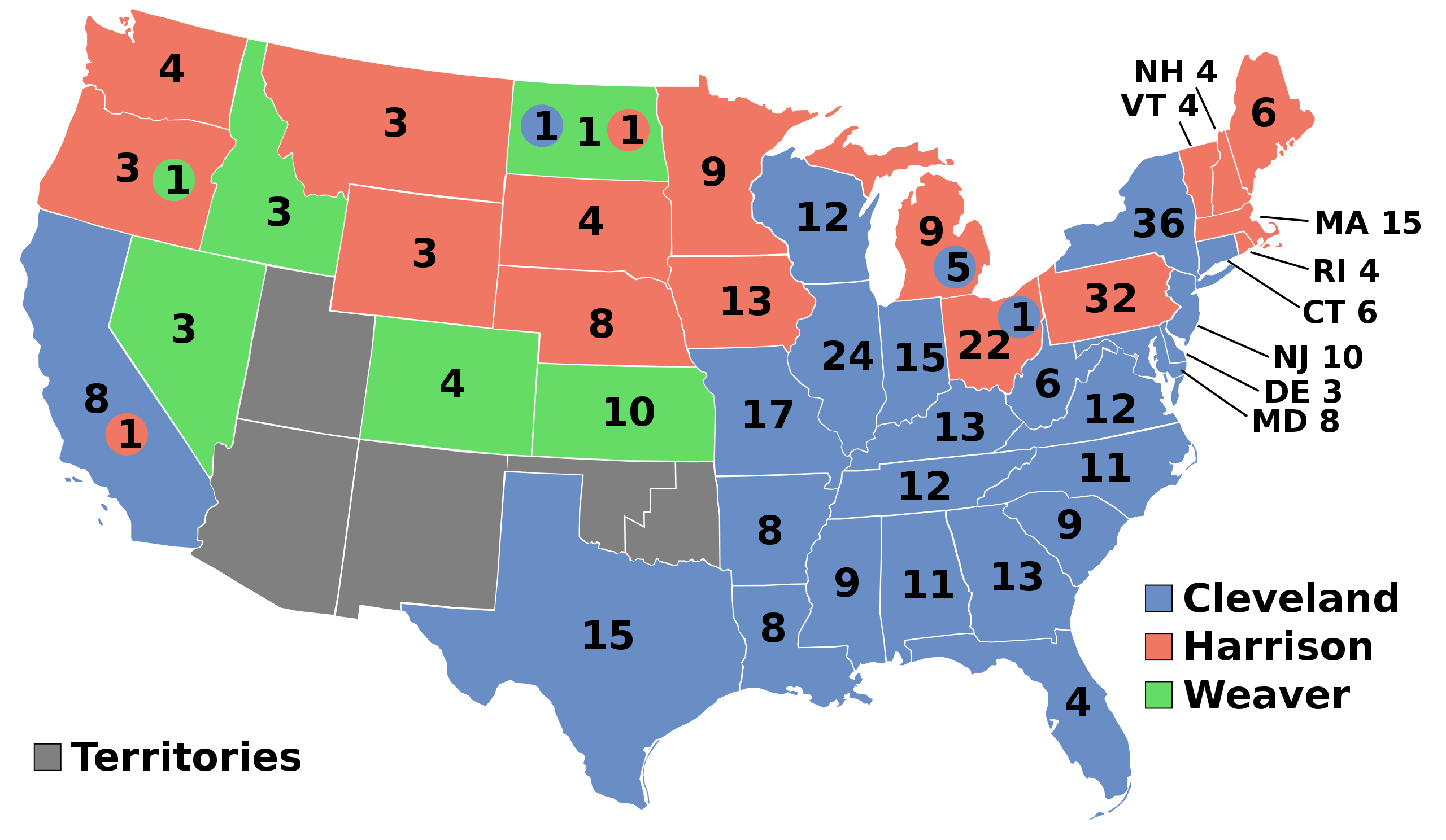 The Populists had quite a bit of support in the South in addition to the West but failed to break the Democrats' stranglehold on the region. Why was this? Many Southern whites who might have otherwise been tempted to vote for Weaver hesitated to abandon the Democrats for fear that doing so would empower blacks in the South. Indeed, the Populists had a large number of black supporters and this included a Colored Farmers' Alliance that by 1892 numbered almost a million members. After the 1892 election, state governments in the South were taking no chances. Suppression of black voters increased and within a decade the voting rights of Southern blacks had been all-but snuffed out.This was the first presidential election to involve North and South Dakota, Wyoming, Montana, Idaho, and Washington, all admitted in 1889-90--no new states had been admitted since Colorado 14 years earlier as Democrat Congresses long resisted admitting more states that seemed likely to provide additional Republican votes.