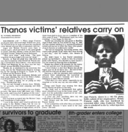 At his trial, Thanos displayed no remorse and said he wanted to dig up the victims and defile their corpses. "Their cries bring laughter from the darkest caverns of my soul. I don't believe I could satisfy my thirst yet in this matter unless I was to be able to dig these brats' bones up out of their graves right now and beat them into powder and urinate on them and then stir it into a murky yellowish elixir and serve it up to their loved ones," he declared.Thanos was sentenced to death. He refused to appeal his conviction, but did argue that Maryland's gas chamber was cruel and unusual punishment and insisted on having his execution videotaped and his EEG data recorded as proof. The state legislature agreed to replace the gas chamber with lethal injection and that was the method used when he was executed May 17, 1994, the first person put to death by the Old Line State in 33 years.