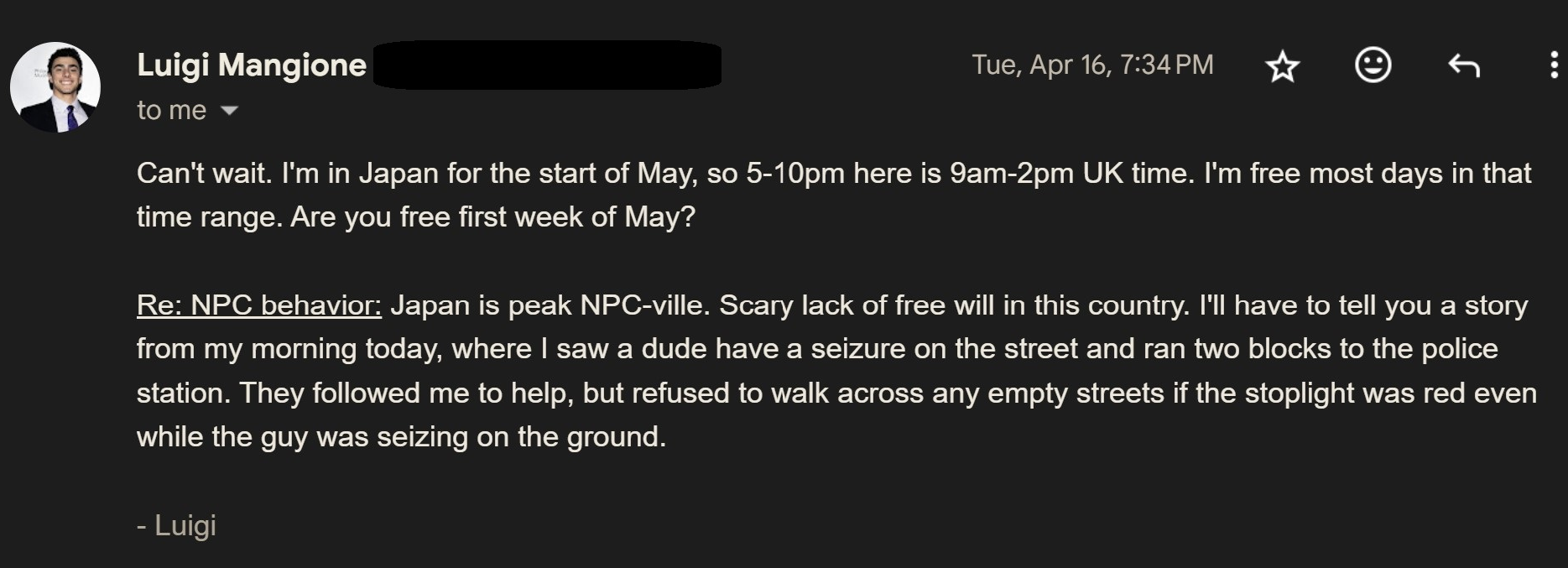 >>18389066The idea that following your instincts is not NPC behavior is laughable. Those are quite literally your biological programming. If anything it's by building meaning through symbols and culture that you escape that condition and the Japanese are some of the best at doing that.