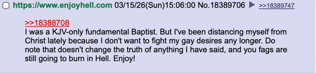 >>18391282>the problem is with Baptists like Pastor Steve Anderson who claim that the KJV is divinely ordained and contains no errors.1. The problem is you.2. The KJV is the perfect word of God, in your own language. That's why you hate it so much.3. It contains no errors. 4. Those flames just got hotter. Keep going.