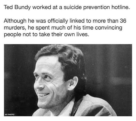 >>18390309Your first mistake is presupposing good and evil actually exists. Second mistake is assuming Ted Bundy worked there for any selfless reason. His time spent working there likely taught him the words to use to manipulate emotionally vulnerable people.