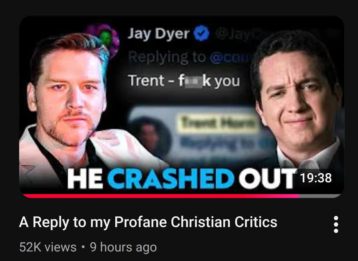 I don't know why guys like Jay Dyer and Andrew Wilson can't just be humble and admit that they've both been overly wrathful profane and just admit that they've sinned and try to take a more, oh I don't know, Christ-like approach. I get why Nick Fuentes wouldn't because he's just a literal psychopath and actually an evil person. I think guys like Sam Shamoun and David Wood also come off a little uncharitable sometimes to their Muslim opponents, or overly disrespectful, but they're nothing like Dyer or Wilson in how they act, and they've done more good than bad. It seems like the EO e-apologists are becoming way worse than the Rad Trads. Way way worse. They don't do any good for the religion and they stop to same low lows Muslim apologists typically do. Christians should let their line so shine before men, that they may see our good works, and praise our Father in heaven (Matthew 5:16), not stoop to the morals of Muslims to, what, fight fire with fire!?