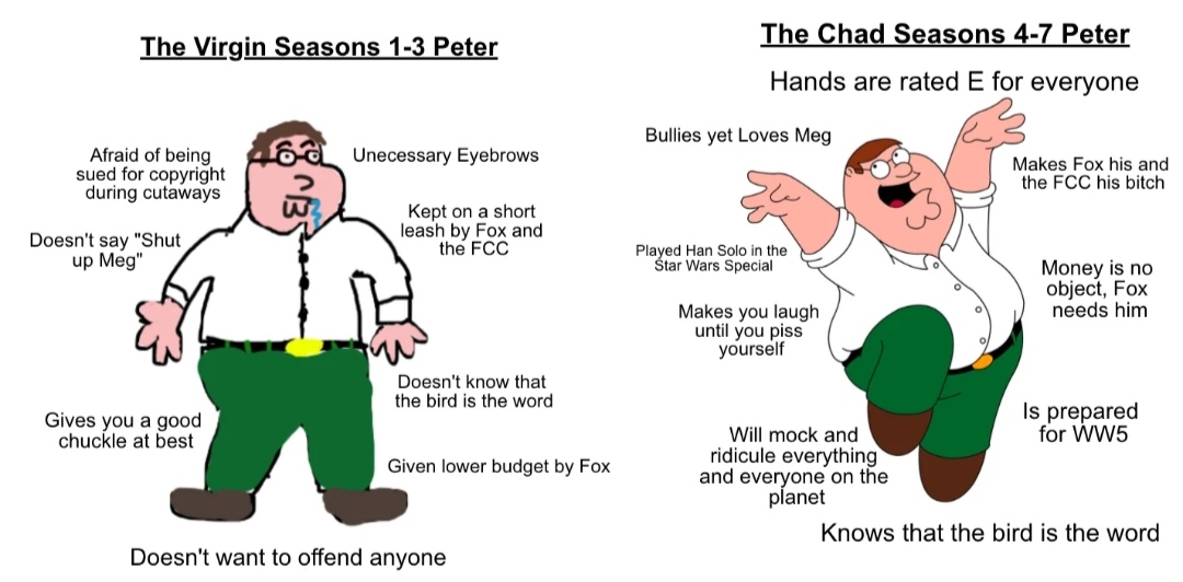 >>18404307Family Guy is one of the few cartoons that actually got better as the seasons went on imo. The earliest seasons didn't really age that well, Stewie was less "evil genius" and more like "he's a baby but he's super edgy" which you can only derive so much humor from and a lot of it in earlier seasons was actually kind of cringe