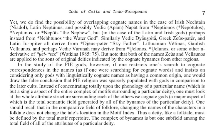 >>18405911>*U̯elonos, *U̯elunosA variation *-onus ~ *-unos doesn't make much sense, and I'm not sure why the author gives this. It is possible that the words involved use the root *u̯el- but, again, the Lithuanian word still needs clarification.>In the study of the PIE gods, however, if one restricts one's search to cognate correspondences in the names (as if one were searching for cognate words) and insists on considering only gods with linguistically cognate names as having a common origin, one would draw the false conclusion that PIE religion was sparsely populated with gods in comparison to the later cults. Instead of concentrating totally upon the phonology of a particular name (which is but a single aspect of the entire complex of motifs surrounding a particular deity), one must look at the whole attribute structure surrounding each of the otherwise cognate gods (a major aspect of which is the total semantic field generated by all of the bynames of the particular deity). One should recall that in the comparative field of folklore, changing the names of the characters in a folktale does not change the tale's location in the Motif Index. Thus a deity, like a folktale, must be defined by the total motif repertoire. The complex of bynames is but one subfield among the total field of all of the attributes of a particular deity.I agree with this paragraph.