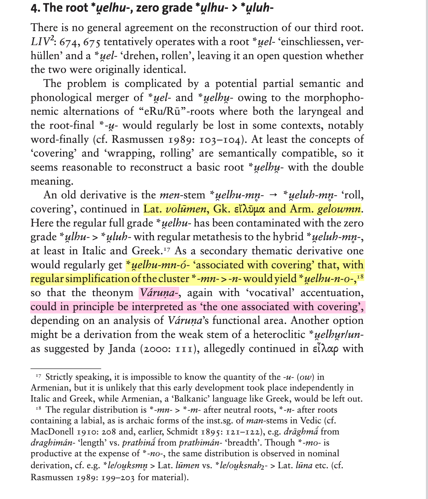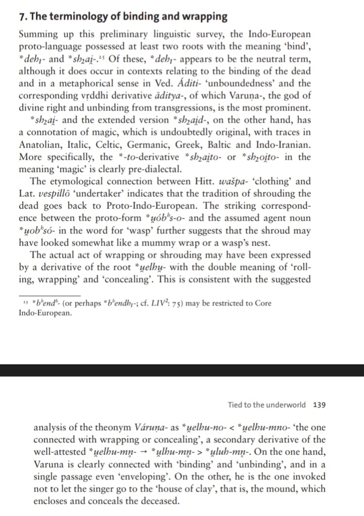 >>18405612>Vedic VáruṇaḥI took a minute to find a reasonable analysis of this word for you.In short, it appears to reflect PIE *u̯elHu-mn+ó- and is cognate with• Lat ⟨volūmen⟩• Gk ⟨eílūma⟩• Arm ⟨gelowmn⟩https://logeion.uchicago.edu/%CE%B5%E1%BC%B4%CE%BB%CF%85%CE%BC%CE%B1