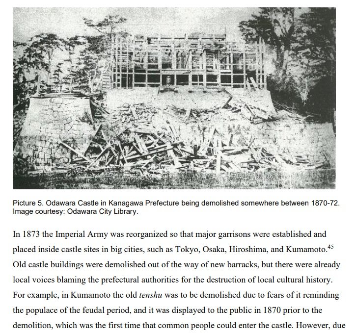 >>18413102>>18413113>>18413119>>18413130https://twitter.com/namatsuu/status/1671519848289935361>Sadly, most of these castles were lost during the Meiji Restoration in the late 1800's. For 300 years castles had dominated the townscape, but they were seen as obsolete feudal relics in contrast to modern, Western architecture, and dozens were ruthlessly demolished. 6/