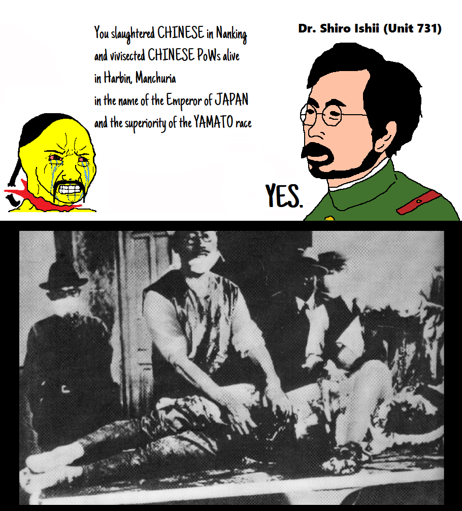 >>18413139Shiro Ishii singlehandedly slaughtered more Japanese troops on the battlefield with his diseased bio weapons, than enemy Chinese soldiers.He forced Japan to halt the entire Zhejiang campaign in 1942 after masscring Japanese soldiers with cholera bombs meant for Chinese.https://apjjf.org/tsuneishi-keiichi/2194/article>Beginning in 1942, Japan began dropping pathogens from airplanes into battlefield zones, on a scale that amounted to a combat operation. In April, Japan launched the Zhejiang campaign. In this campaign, Ishii and company carried out massive biological weapons attacks. Cholera bacteria was the main pathogen employed, and the attacks resulted in more than 10,000 casualties. It has also been reported that some victims contracted dysentery and the plague. More than 1700 soldiers died, mostly from cholera. This would have been considered a great success for the Ishii group, but for the fact that all of the victims were Japanese soldiers.>A Japanese medic captured by American forces at the end of 1944 described the casualties among the Japanese army during his interrogation: “When Japanese troops overran an area in which a [biological weapons] attack had been made during the Chekiang [Zhejiang] campaign in 1942, casualties upward from 10,000 resulted within a very brief period of time. Diseases were particularly cholera, but also dysentery and pest [bubonic plague]. Victims were usually rushed to hospitals in rear. … Statistics which POW saw at Water Supply and Purification Dept Hq at Nanking showed more than 1,700 dead, chiefly from cholera; POW believes that actual deaths were considerably higher, ‘it being a common practice to pare down unpleasant figures.’” [3]