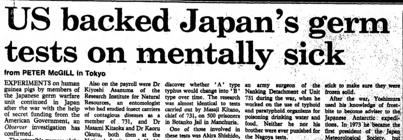 >>18413139>>18413143>>18413145>>18413147Tons of Japanese girls and women were left behind in Manchukuo in 1945 and became wives of Chinese men,they are called Zanryu-Fujin.https://desuarchive.org/his/thread/18248003/#q18248384The US government funded Japanese unit 731 scientists to conduct biological germ tests on Japanese civilians after World War II, including Japanese children.https://theguardian.newspapers.com/clip/122763034/postwar-japan-us-backed-japans-germ/From 1983 UK Observer scoop - "Experiments on human guinea pigs by members of the Japanese germ warfare unit continued in Japan after the war with the help of secret funding from the American Government"Multiple Japanese including a child died from the experiments and another committed suicide after being used as a guinea pig."The ostensible purpose of the work was to develop vaccines to fight disease... The money for the experiments came from the American 406th Division, part of the occupation forces... A number of Japanese doctors associated with Unit 731 were signed up as advisers....""To test treatments for scrub typhus, the team instructed researchers to infect patients in a mental hospital in Niigata." Between 1953-1956, 118 patients were infected. Nine died, "another committed suicide rather than continue as a human guinea pig.""An investigation by the Tokyo Justice Ministry concluded that no permission from relatives had been obtained for the experiments, and there was no question of the tests being a form of treatment to 'cure' the patients, as the hospital claimed."Finally, I want to give credit to British researchers, Peter Williams and David Wallace. Their 1989 book, "Unit 731: The Japanese Army's Secret of Secrets," referenced the Observer article. The US printing of the book deleted the chapter the reference was in, so make sure you use the British edition by Hodder & Stoughton if you want to follow up this reference.