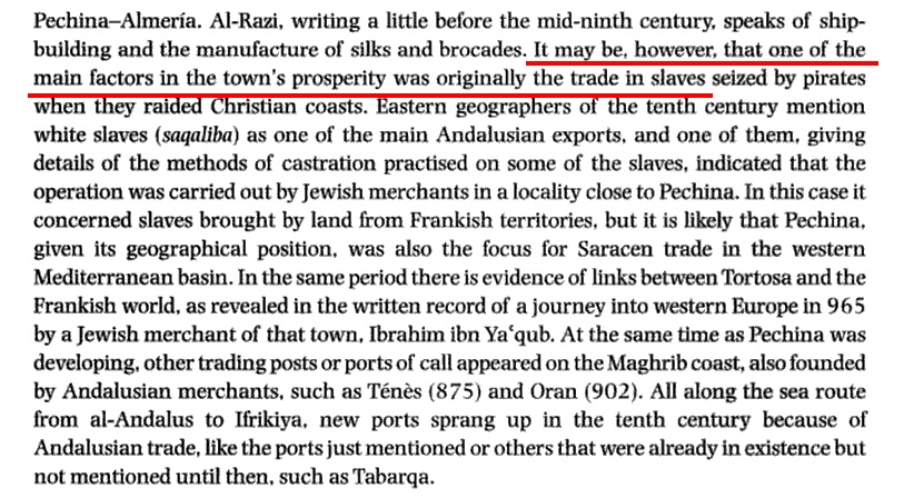 >>18413259>>18413286>>18413310Almanzor's campaigns were a continuation of a policy from emirate times: the capture of numerous contingents of Christian slaves, the famous esclavos or francos, in Arabic Saqtïliba or Saqáliba (plural of Siqlabi, "slave").[477] These were the most lucrative part of the loot, and constituted an excellent method of paying the troops, so much so that many campaigns were little more than slave raids.[478] From these came many eunuchs who were essential elements for handling harems; others were purchased already castrated in Verdun and disembarked in Pechina or Almería according to Liutprand of Cremona.[479] However, the most valuable take was the beautiful girls, selected according to "the predilection they had for the blonde and redhead Galicians, Basques and Franks,"[480] usually also described as having blue eyes, large breasts, wide hips, thick legs and perfect teeth[481] that "the gynaecea of the royal families and the aristocracy supplied as concubines and legitimate wives."[479] As in the case of the eunuchs, some slaves were bought from pirates attacking the Mediterranean coast, others came from Slavic or Germanic populations passing through several hands from Vikings, and there were also blacks imported from Sudan.[482] Most of these slaves, however, were children who would be Islamized and assigned to work at court, including the work of eunuchs.[479] Jews and, to a lesser extent, Muslims were involved in this lucrative trade, thanks to their ability as interpreters and ambassadors.[479]